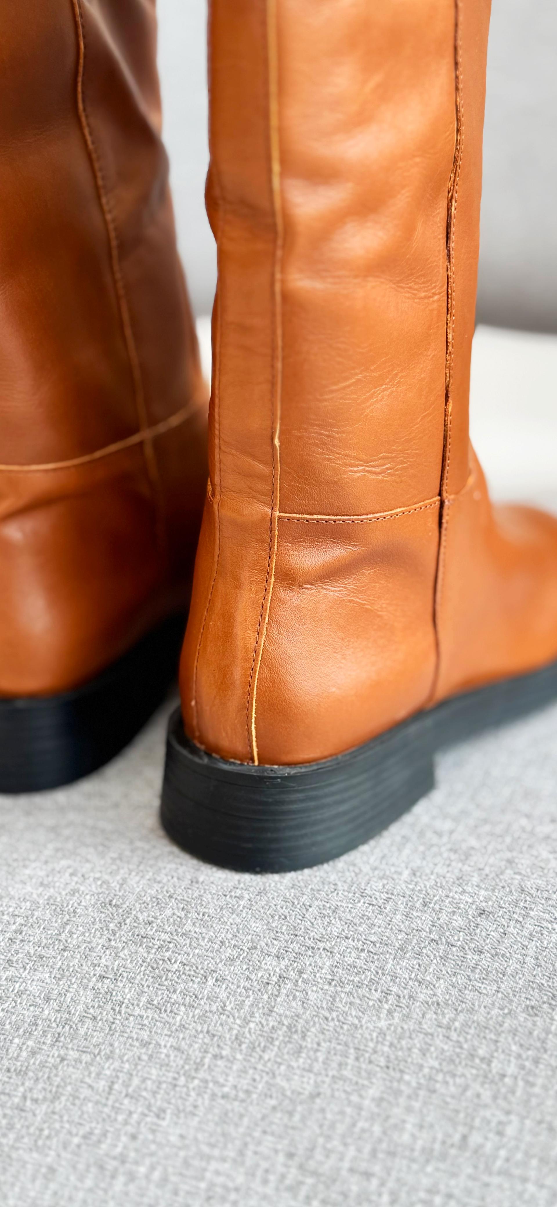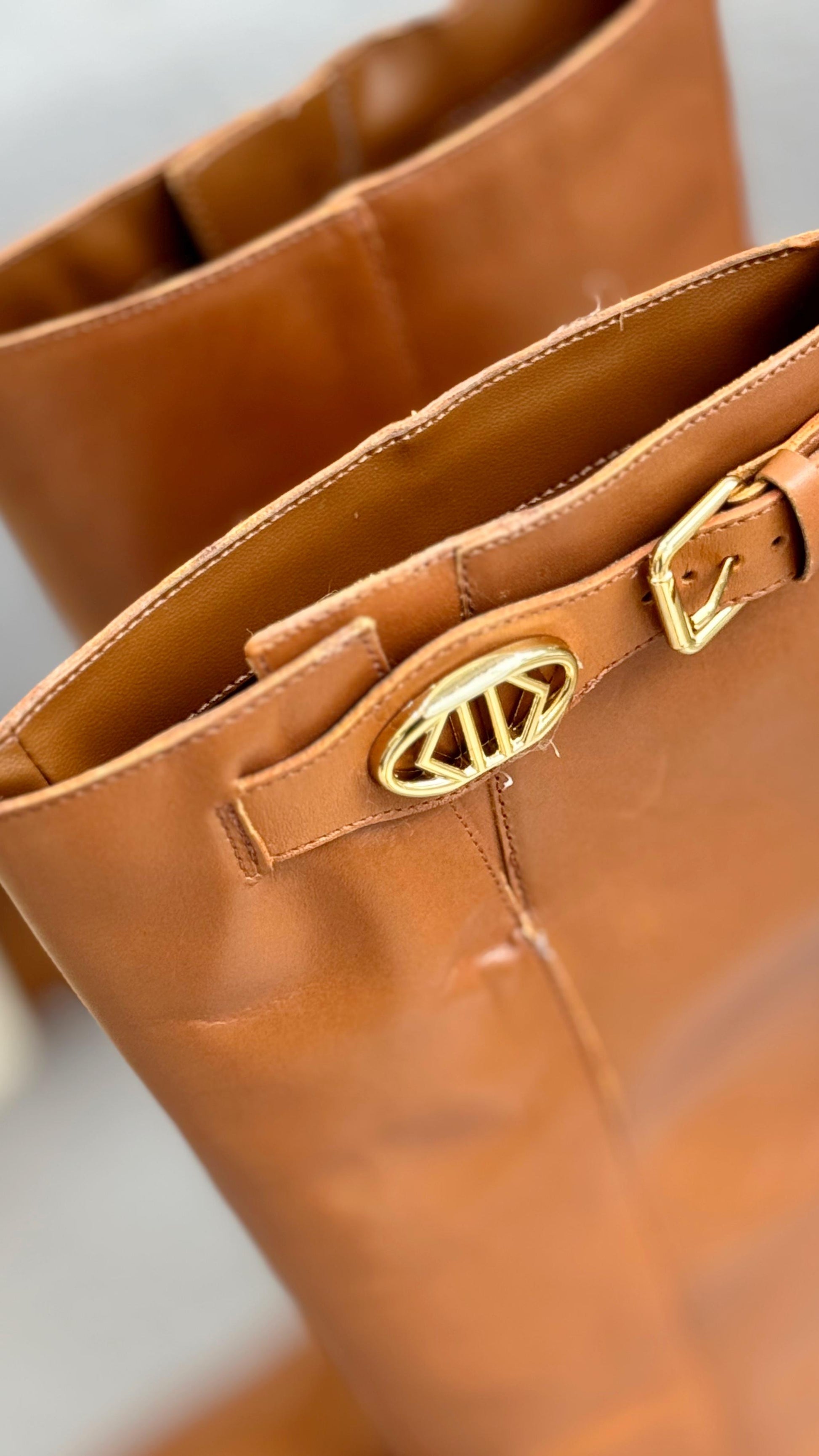 Bota marrom de couro. O sapato tem cano longo, salto baixo bloco em fachete e formato arredondado na ponta. Traz cabedal ajustado ao pé e tira em torno do cano, na parte superior, com aplicação de metal geométrico vazado e fivela.
