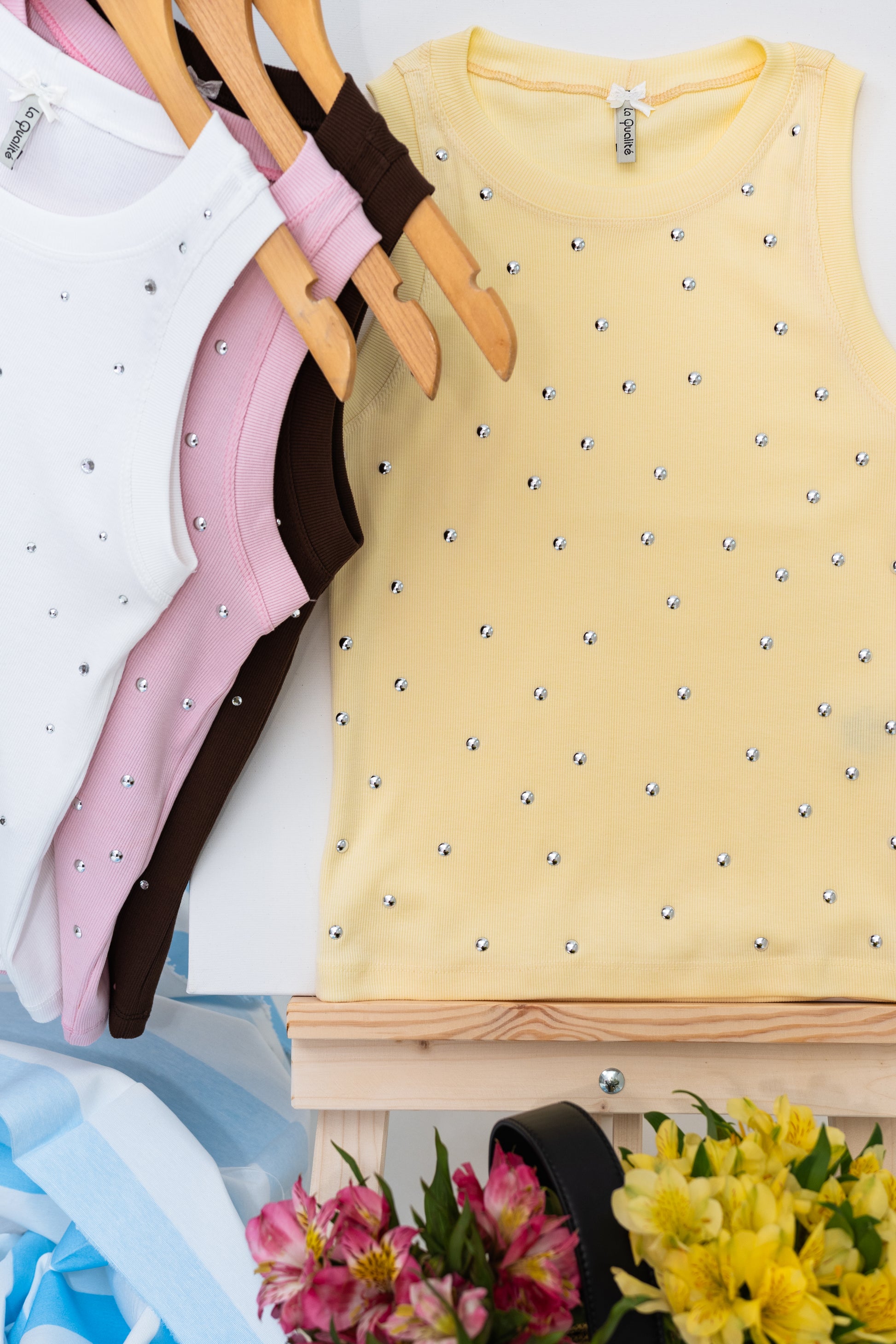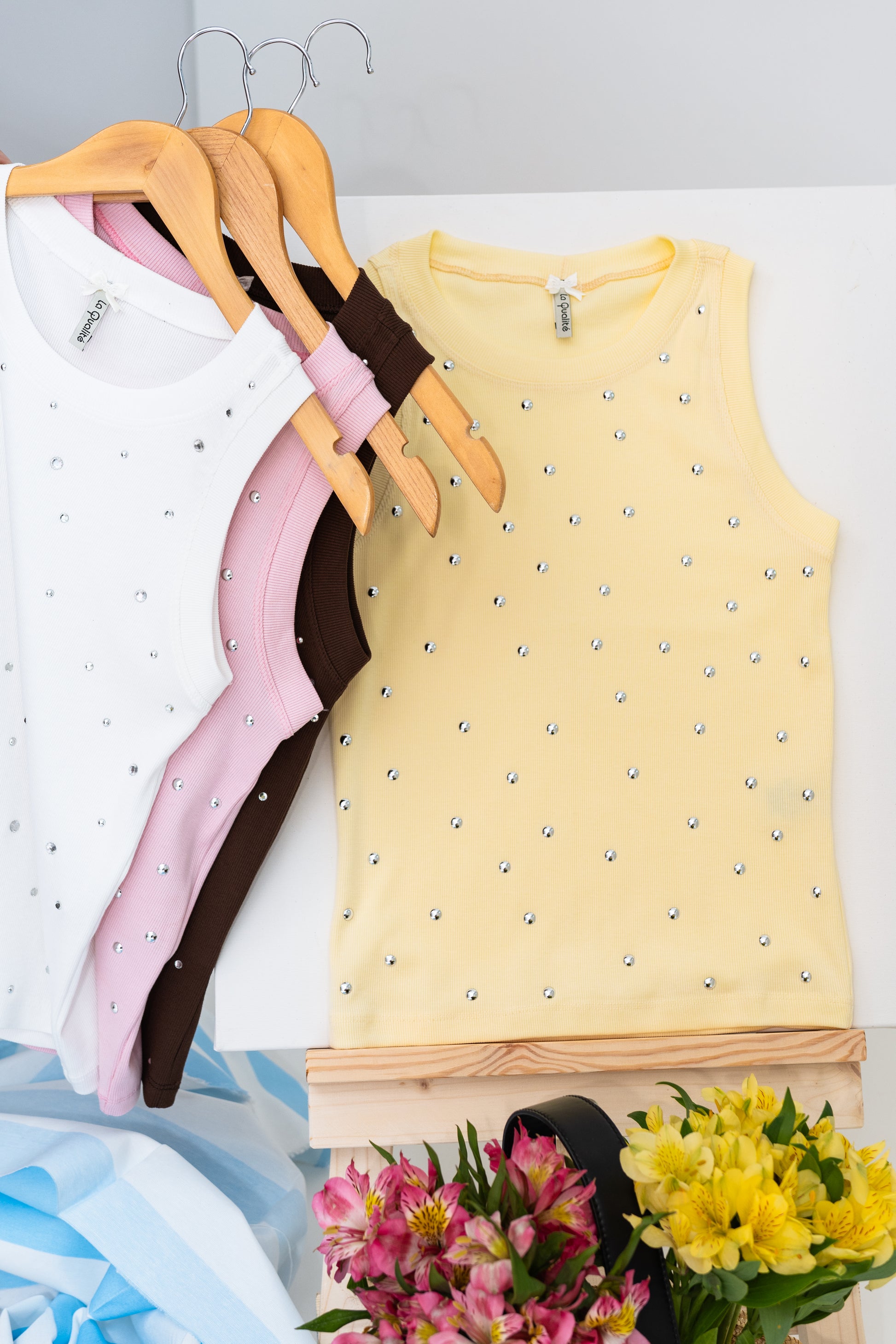 A regata canelada com gola redonda é uma peça essencial e versátil no guarda-roupa feminino. Seu design canelado não apenas garante um caimento ajustado e confortável, mas também traz textura à peça. O destaque fica por conta dos detalhes em pedrinhas na parte frontal, adicionando um toque de sofisticação e delicadeza.