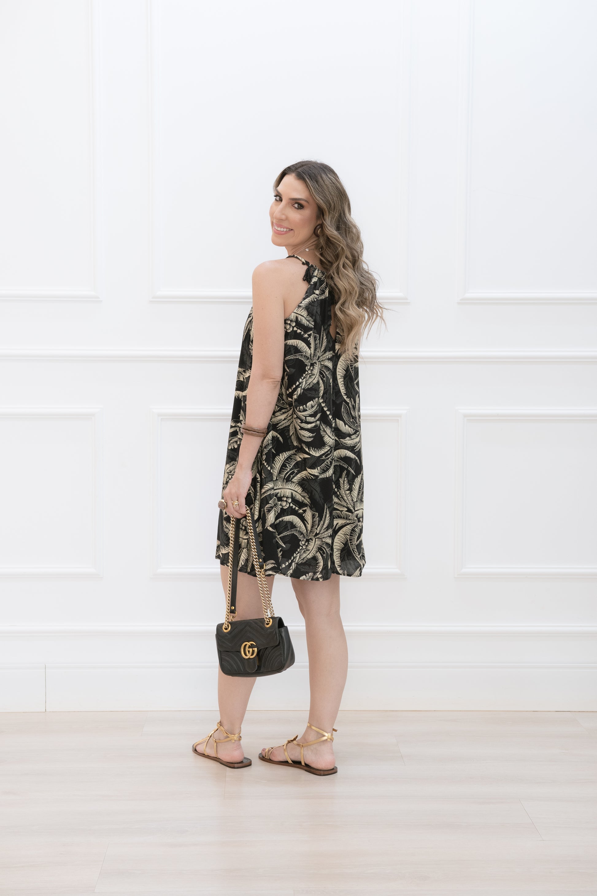 Com um caimento fluido impecável, este vestido curto estampado é sinônimo de versatilidade. O fechamento por amarração adiciona um detalhe refinado, tornando a peça perfeita para produções elegantes e contemporâneas.