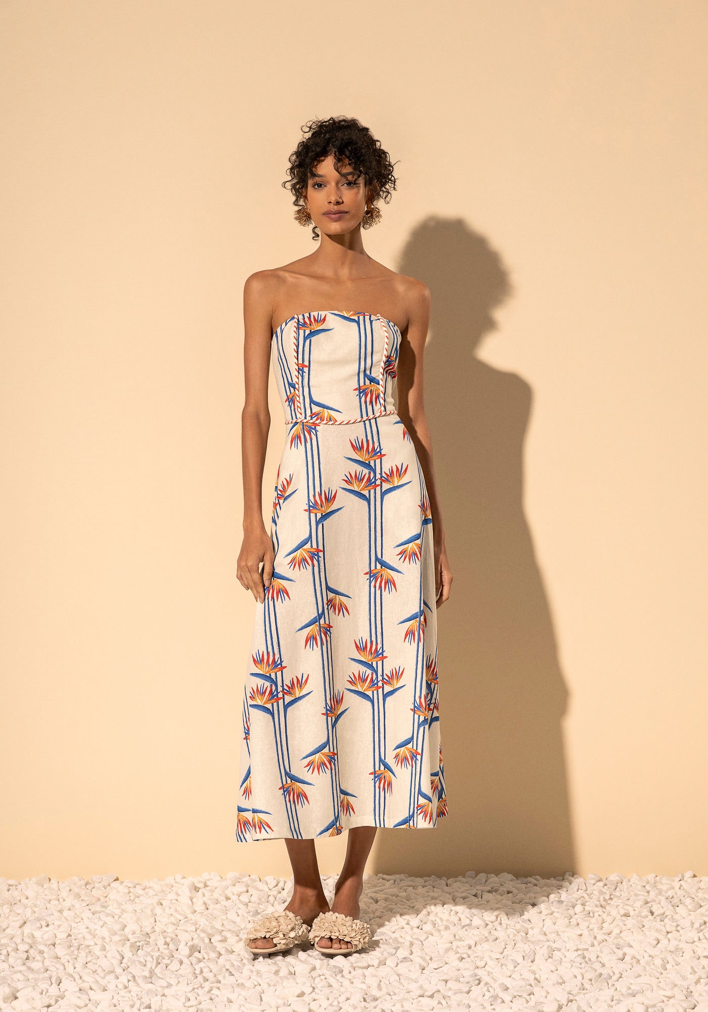 Vestido Lez a Lez estampado, com linho na composição, traz recortes com cordão em seu busto acinturado e uma barra ampla que cria um contraste elegante. Os bolsos laterais adicionam praticidade e um toque moderno à peça.